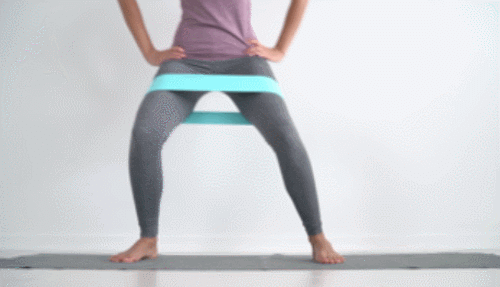 매트에 서서 허벅지 사이에 탄력 밴드를 끼웁니다. 그리고 손은 옆구리에 가져가세요. 그런 다음 왼쪽 다리를 왼쪽 방향으로 이동하면서 사이드 워크 동작을 진행하면 되는데요. 무릎을 살짝 구부린 상태를 유지하며 좌우로 1분간 움직입니다.