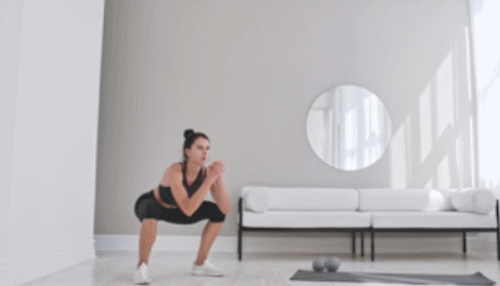 다리를 어깨너비보다 넓게 벌리고 서서 시작합니다. 그리고 엉덩이를 낮추면서 스쿼트를 진행하세요. 2회 스쿼트 후, 원래 자세로 돌아오면서 점프하고, 다시 스쿼트 자세로 연결합니다. 1분 동안 스쿼트 변형 동작을 진행하며, 하루 100회를 목표로 운동하세요.