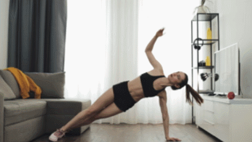 플랭크 기본자세에서 오른손으로 버티면서 왼손을 공중으로 뻗어주세요. 사이드 플랭크 자세로 전환합니다. 다시 플랭크 자세로 돌아오고, 왼손으로 버티면서 오른손을 들어줍니다. 사이드 플랭크 자세를 좌우로 번갈아 만들면서 1분간 운동하세요.