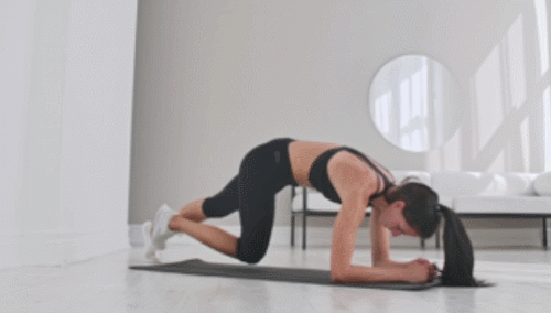 매트에 팔뚝을 대고 엎드려서 팔꿈치 플랭크 자세를 만듭니다. 그리고 왼쪽 무릎을 오른쪽 팔꿈치로 당겼다가 되돌리고, 오른쪽 무릎을 왼쪽 팔꿈치로 당겼다가 되돌립니다. 시선은 바닥을 응시하며, 1분간 다리를 번갈아 교차하세요.