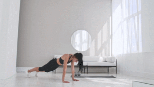 무릎을 구부리면서 스쿼트 자세를 만들고, 손바닥을 바닥에 대고 살짝 점프하여 엎드리세요. 그리고 다시 다리를 점프하여 당기고, 일어서면서 점프하여 몸을 공중으로 띄웠다가 착지합니다. 그런 다음 스쿼트 동작으로 연결하면 되는데요. 1분간 버피 동작을 진행합니다.