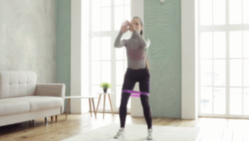 바닥에 서서 허벅지에 탄력 밴드를 끼웁니다. 그리고 엉덩이를 낮추면서 스쿼트를 1회 하고, 원래 자세로 돌아오세요. 그런 다음 오른쪽 다리를 왼쪽 다리 뒤로 대각선 방향으로 뻗으면서 리버스 런지 자세를 1회 하고, 돌아옵니다. 스쿼트와 리버스 런지 동작을 번갈아 가면서 1분간 운동합니다.