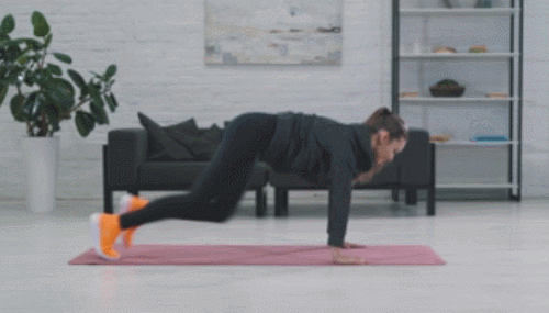매트에 플랭크 자세로 엎드립니다. 그리고 왼쪽 무릎을 당겼다가 되돌리고, 오른쪽 무릎을 당기는 동작으로 연결합니다. 점차 속도를 높이면서 다리를 교차하세요. 1분 동안 반복하고, 시선은 바닥을 향하며, 상체 균형을 유지하세요.