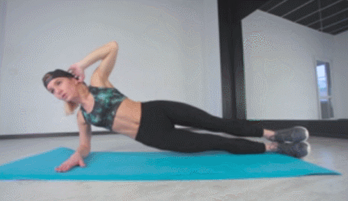 오른쪽 팔뚝을 대고 옆으로 눕고, 왼손은 머리 옆으로 붙이세요. 그리고 엉덩이를 바닥으로 내렸다가 드는 업다운 동작을 30초 진행합니다. 이번에는 왼쪽 팔뚝을 대고 옆으로 누워서 사이드 플랭크 자세를 만들고, 엉덩이를 움직이면서 30초 운동하세요.