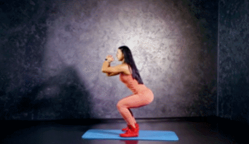 어깨너비로 다리를 벌리고 서서 손을 가슴 앞에서 모아주세요. 시선은 정면을 향하고, 스쿼트를 진행합니다. 2회 진행 후, 일어서면서 왼쪽 다리를 뒤로 뻗어줍니다. 다시 스쿼트를 2회 진행 후, 일어서면서 오른쪽 다리를 뒤로 뻗어주세요. 1분간 반복합니다.
