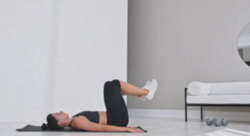 매트에 누워서 시작하고, 상체를 살짝 일으킵니다. 그리고 다리를 공중으로 띄우세요. 상체는 띄운 상태로 왼쪽 무릎을 당겨서 양손으로 정강이를 눌러주고, 오른쪽 무릎으로 동일하게 반복합니다. 1분 동안 다리를 당기면서 운동하세요.