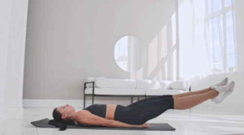 매트에 등을 대고 누운 상태로 다리를 공중으로 띄웁니다. 다리 사이가 벌어지지 않도록 하고, 바닥에서 90도 각도로 들어주세요. 그리고 시계 방향으로 원을 그리듯 돌립니다. 30초 진행 후, 반시계 방향으로 30초 진행하세요.