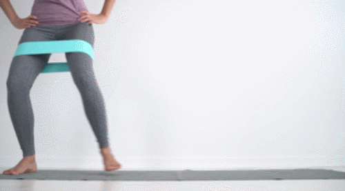 매트에 서서 허벅지 사이에 탄력 밴드를 끼웁니다. 그리고 손을 옆구리에 가져가세요. 그런 다음 왼쪽 다리를 왼쪽 방향으로 옮기면서 사이드 방향으로 걸으면 되는데요. 무릎은 살짝 구부린 상태로 유지합니다. 좌우로 움직이면서 1분간 운동하세요.