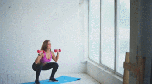 어깨너비보다 조금 넓게 다리를 벌리고 서서 시작하세요. 손에 아령을 들거나 생수병을 들어줍니다. 그리고 무릎을 구부리면서 엉덩이를 내리고, 스쿼트 동작을 진행하세요. 팔꿈치를 구부리면서 아령을 내려줍니다. 그런 다음 일어서면서 손을 머리 위로 뻗어주세요. 1분간 반복합니다.