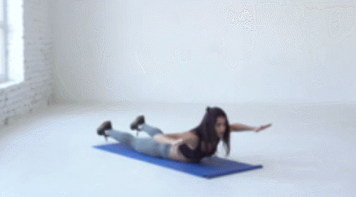 매트에 배를 대고 엎드린 상태로 상체와 하체를 동시에 들어줍니다. 그리고 팔을 앞으로 뻗었다가 팔꿈치를 구부리면서 W자 모양을 만드세요. 상체와 하체가 바닥에 완전히 닿지 않도록 자세를 유지하면서 1분간 반복합니다.