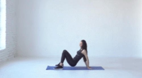 매트에 엉덩이를 대고 앉아서 시작합니다. 그리고 왼손으로 버티면서 몸을 공중으로 띄우고, 오른손을 왼쪽 방향으로 들어줍니다. 동시에 상체도 틀어주세요. 원래 자세로 돌아오면, 오른손으로 버티면서 왼손을 들어주는 동작으로 반복하세요. 1분간 운동합니다.