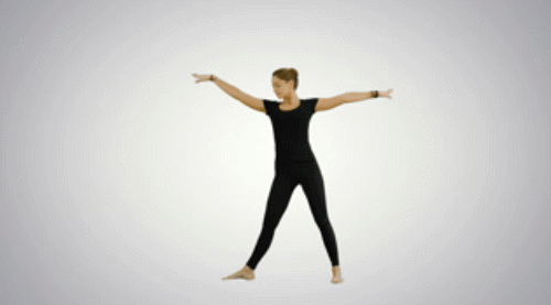 정면을 보고 서서 오른쪽 발목을 오른쪽 방향으로 틀어줍니다. 그리고 다리를 뻗어주세요. 그런 다음 팔을 옆으로 펼치고, 오른손을 바닥으로 내리면서 왼손을 공중으로 뻗습니다. 오른손으로 오른발을 잡고, 시선은 왼손을 향하세요. 1분간 좌우로 번갈아 가면서 움직입니다.