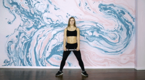 손에 아령이나 덤벨을 들고 서서 시작하세요. 어깨너비보다 다리를 넓게 벌리고 섭니다. 그리고 팔꿈치가 구부러지지 않도록 펴고, 무릎을 구부리면서 스쿼트 동작을 진행합니다. 시선은 정면을 향하고, 상체는 펴줍니다. 1분간 반복하세요.