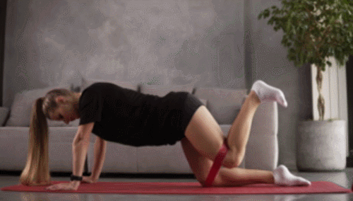 무릎 근처에 탄력 밴드를 걸치고, 매트에 엎드려서 네발기기 자세를 만듭니다. 그리고 왼쪽 다리를 공중으로 들고, 무릎을 90도 각도로 구부리세요. 그런 다음 다리를 내렸다가 드는 동작을 30초 진행하세요. 반대편 다리로 30초 반복합니다.