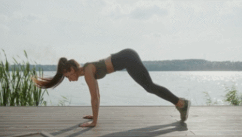 매트에 플랭크 기본자세로 엎드리세요. 그리고 다리를 손목 방향으로 점프하여 당겨주고, 상체를 일으킵니다. 그런 다음 엉덩이를 내리면서 스쿼트를 1회 진행하세요. 다시 손목을 바닥에 짚으면서 다리를 점프하여 플랭크 기본자세로 돌아갑니다. 1분간 반복하세요.