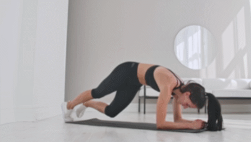 매트에 팔뚝을 대고 엎드리는 팔꿈치 플랭크 자세를 만드세요. 그리고 왼쪽 무릎을 오른쪽 팔꿈치로 당겼다가 되돌리고, 반대편 무릎도 동일하게 크로스 방향으로 반복하세요. 1분 동안 다리를 움직이면서 운동합니다.