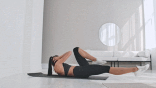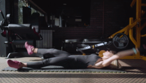 매트에 등을 대고 누운 상태에서 손을 머리 옆으로 옮기세요. 그리고 다리를 공중으로 띄웁니다. 그런 다음 왼쪽 무릎을 당기면서 상체를 들고, 오른쪽 팔꿈치를 가져갑니다. 이번에는 오른쪽 무릎을 당기면서 왼쪽 팔꿈치를 가져가세요. 1분간 진행합니다.
