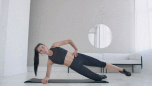 오른쪽 팔뚝과 무릎을 매트에 대고 옆으로 누워서 시작합니다. 그리고 왼손은 옆구리에 가져갑니다. 시선은 정면을 향하고, 왼쪽 다리를 공중으로 들었다가 내리는 동작을 30초 진행하세요. 반대편으로 돌아서 눕고, 오른쪽 다리를 드는 동작을 30초 반복합니다.