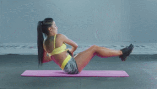 매트에 엉덩이를 대고 앉아서 다리를 뻗어줍니다. 그리고 손에 생수병이나 아령, 볼 등을 들어주세요. 그런 다음 상체를 뒤로 젖히면서 다리를 공중으로 띄우세요. 자세가 무너지지 않도록 균형을 유지하고, 상체를 좌우로 움직입니다. 1분간 운동하세요.