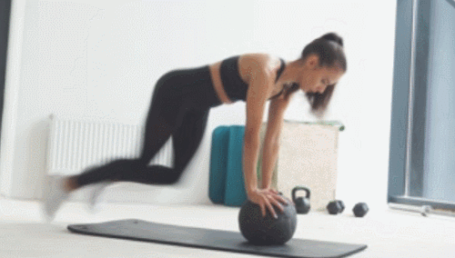 매트에 엎드려서 볼 위에 손을 올립니다. 맨손으로 진행해도 무방합니다. 그리고 왼쪽 무릎을 당겼다가 제자리로 돌아가면서 오른쪽 무릎을 당겨주세요. 1분 동안 다리를 번갈아 움직이면서 반복하면 되는데요. 균형을 유지하고, 시선은 바닥을 응시합니다.