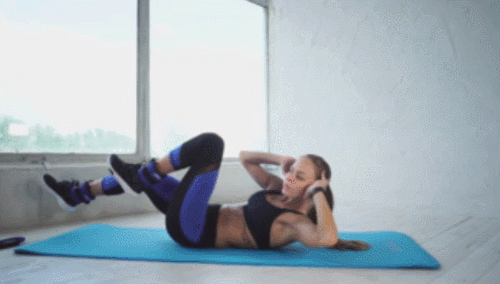 매트에 등을 대고 누운 상태에서 손을 머리 옆으로 이동합니다. 그리고 다리를 공중으로 띄우고, 왼쪽 무릎을 당기면서 오른쪽 팔꿈치를 가져갑니다. 제자리로 돌아가면, 반대편 무릎과 팔꿈치를 움직이세요. 1분 동안 속도를 조절하며 운동합니다.