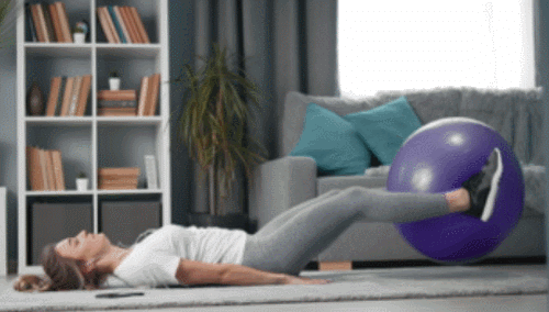 매트에 누워서 다리 사이에 짐볼을 끼웁니다. 그리고 다리를 천천히 공중으로 최대한 들었다가 내리는 동작을 반복하면 되는데요. 복부에 힘을 주면서 바닥으로 누르고, 허리가 들리지 않도록 주의하세요. 1분간 반복합니다.