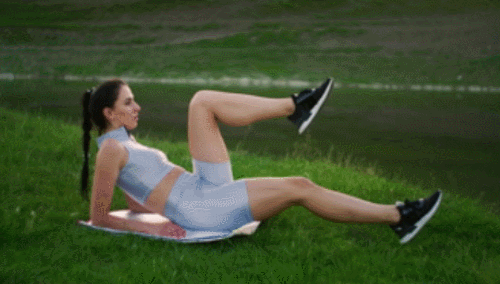 매트에 엉덩이를 대고 앉고, 팔뚝으로 지탱하면서 상체를 뒤로 젖힙니다. 그리고 다리를 공중으로 들어주세요. 그런 다음 오른쪽 무릎을 당겼다가 펴주면서 왼쪽 무릎을 당기는 동작으로 연결합니다. 1분간 다리를 움직이세요.