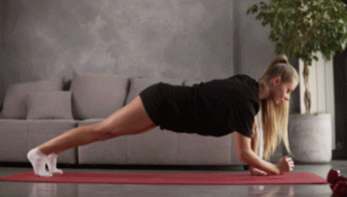 매트에 엎드려서 플랭크 자세를 만드세요. 그리고 오른쪽 팔꿈치를 구부리고, 왼쪽 팔꿈치를 구부리면, 팔꿈치 플랭크 자세가 완성됩니다. 다시 팔꿈치를 펴고, 원래 자세로 돌아옵니다. 1분간 플랭크 업다운 동작을 반복하세요.