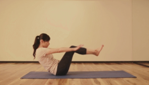 매트에 엉덩이를 대고 앉은 상태에서 상체를 뒤로 기울이고, 다리를 들어서 무릎을 구부립니다. 팔은 앞으로 뻗어서 균형을 잡으세요. 그리고 복부를 향해 상체와 하체를 당겼다가 펴주는 동작과 함께 팔을 위아래로 움직입니다. 1분간 반복하세요.