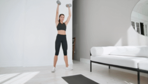 아령이나 생수병을 활용하여 운동 효과를 높일 수 있는데요. 다리를 어깨너비보다 넓게 벌리고 서서 시작하세요. 손을 머리 위로 뻗고, 무릎을 구부리면서 스쿼트 동작을 진행합니다. 동시에 팔꿈치를 구부려서 아령을 내렸다가 올립니다. 1분간 운동하세요.