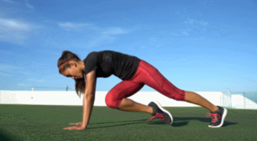 매트에 손바닥을 대고 엎드려서 플랭크 기본자세를 잡습니다. 그리고 왼쪽 무릎을 오른쪽 팔꿈치로 당겼다가 되돌리고, 오른쪽 무릎을 왼쪽 팔꿈치로 당겼다가 되돌립니다. 1분 동안 다리를 움직이면 되는데요. 시선은 바닥을 향하도록 하고, 상체는 움직이지 않도록 고정합니다.