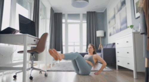 매트에 엉덩이를 대고 앉은 상태로 상체를 뒤로 젖히면서 다리를 공중으로 띄웁니다. 무릎을 살짝 구부리고, 균형이 무너지지 않도록 복부에 힘을 주면서 자세를 유지하세요. 그리고 상체를 오른쪽으로 돌렸다가 돌아오고, 왼쪽으로 돌렸다가 돌아옵니다. 1분간 반복하세요.