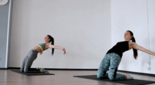 매트에 무릎을 꿇고 앉은 상태에서 상체를 일으킵니다. 그리고 상체를 뒤로 젖히면서 몸을 뒤로 기울이세요. 동시에 양팔을 옆으로 펼쳤다가 돌아오면서 앞으로 모아주세요. 1분 동안 낙타 변형 동작을 진행하세요.