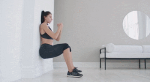벽 앞에 서서 시작하세요. 벽에 등을 기대고, 무릎을 구부리면서 스쿼트 자세를 만듭니다. 손은 가슴 앞으로 모아주세요. 허벅지가 바닥과 평행하도록 맞추고, 시선은 정면을 바라봅니다. 1분간 최대한 버티면서 운동하세요.