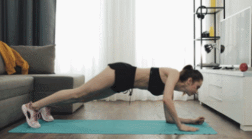 매트에 엎드려서 플랭크 기본자세를 만듭니다. 그리고 오른쪽 팔꿈치를 구부리고, 왼쪽 팔꿈치를 구부려서 팔꿈치 플랭크 자세로 바꾸세요. 다시 팔꿈치를 펴면서 원래 자세로 돌아오면, 1회가 완료됩니다. 1분간 업다운 동작을 진행하세요.