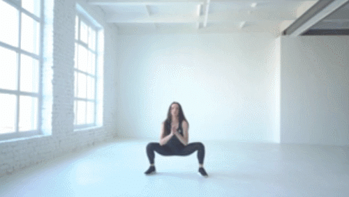 다리를 넓게 벌리고 바닥에 서서 준비합니다. 그리고 무릎을 구부리면서 스쿼트를 1회 하고, 일어서면서 점프합니다. 손은 가슴 앞에서 모았다가 머리 위로 뻗어주세요. 1분 동안 점프 동작과 함께 스쿼트 운동을 반복합니다.