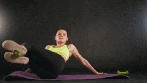 매트에 엉덩이를 대고 앉은 상태에서 상체를 뒤로 젖히고, 팔을 벌려서 바닥에 지탱합니다. 그리고 발 사이에 수건이나 아령을 잡아주세요. 그런 다음 다리를 왼쪽으로 넘겼다가 돌아오고, 오른쪽으로 넘겼다가 돌아옵니다. 1분간 비트는 동작을 진행하세요.