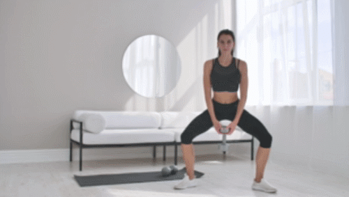 아령이나 생수병을 손에 들고 시작합니다. 다리는 어깨너비보다 넓게 벌리세요. 그리고 팔꿈치가 구부러지지 않도록 편 상태로 아령을 잡아주세요. 엉덩이를 내리면서 스쿼트를 1~2회 하고 원래 자세로 돌아옵니다. 1분간 반복하세요.