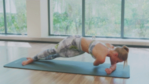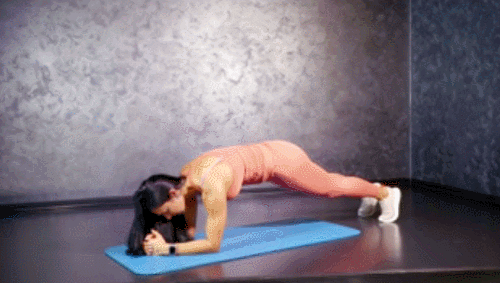 매트에 팔뚝을 대고 엎드린 상태에서 팔꿈치 플랭크 자세를 만듭니다. 그리고 오른쪽 무릎을 당겼다가 되돌리면서 왼쪽 무릎을 당기는 동작으로 연결하세요. 시선은 바닥을 응시하고, 1분 동안 다리를 번갈아 움직이면서 진행합니다.
