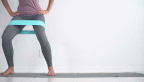 허벅지 사이에 탄력 밴드를 끼우고 바닥에 서서 시작하세요. 그리고 손은 옆구리에 가져갑니다. 그런 다음 왼쪽 다리를 왼쪽 방향으로 이동하고, 반대편 방향으로 동일하게 반복합니다. 다리를 좌우로 움직이면서 1분간 운동하세요.