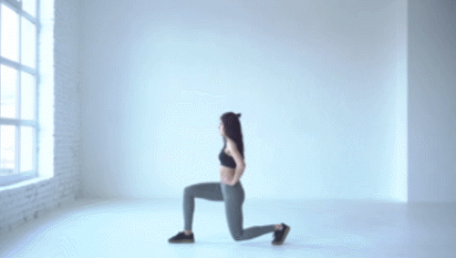다리를 모으고 서서 손을 옆구리로 옮깁니다. 그리고 오른쪽 다리를 앞으로 내딛고, 무릎을 구부리면서 런지 동작을 진행하세요. 30초 동안 운동하고, 반대편 다리를 앞으로 내딛고, 동일하게 런지 동작을 30초 반복하세요.