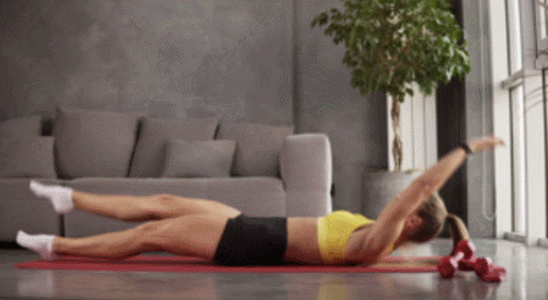 매트에 누워서 손을 머리 위로 뻗어줍니다. 그리고 왼쪽 다리를 천장으로 들면서 상체를 동시에 일으켜서 손으로 다리를 터치합니다. 원래 자세로 돌아가면, 오른쪽 다리를 천장으로 드는 동시에 상체를 일으키세요. 1분간 반복하세요.