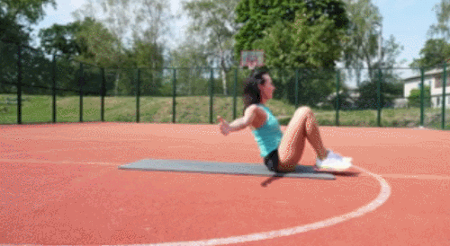 매트에 엉덩이를 대고 앉아서 무릎을 구부리고 발을 바닥에 댑니다. 그리고 몸을 최대한 움츠립니다. 그런 다음 등을 매트에 대면서 누워서 양손으로 정강이를 잡아줍니다. 다시 몸을 일으켜서 원래 자세로 돌아오고, 양손을 옆으로 펼칩니다. 1분간 반복하세요.