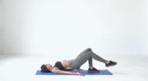 매트에 눕고, 무릎을 세워서 발을 붙입니다. 그리고 오른쪽 다리를 앞으로 뻗으세요. 그런 다음 엉덩이를 들면서 오른쪽 다리를 당겼다가 내리면서 앞으로 뻗습니다. 30초 진행 후, 반대편 다리로 동일하게 30초 반복합니다.