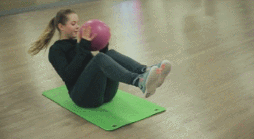 매트에 엉덩이를 대고 앉은 상태로 상체를 뒤로 젖히고, 다리를 띄웁니다. 그리고 무릎을 구부리세요. 손에는 아령이나 볼, 생수병 등을 들어주세요. 그런 다음 손을 움직이면서 상체를 왼쪽으로 틀었다가 오른쪽으로 틀어줍니다. 1분간 진행하세요.