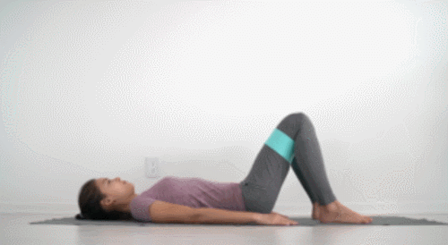 매트에 누운 상태에서 허벅지 사이에 탄력 밴드를 끼우세요. 그리고 무릎을 세우고, 발을 바닥에 고정합니다. 그런 다음 엉덩이를 들어서 브릿지 자세를 만듭니다. 엉덩이를 내렸다가 들면서 업다운 동작을 1분간 진행하세요.