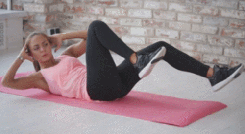 매트에 누운 상태로 손을 머리 옆으로 옮기세요. 그리고 다리를 공중으로 들어줍니다. 상체를 일으켜서 복부 전체를 압박하세요. 그런 다음 왼쪽 무릎을 당기면서 오른쪽 팔꿈치를 틀어주고, 오른쪽 무릎을 당기면서 왼쪽 팔꿈치를 틀어주세요. 1분간 반복합니다.