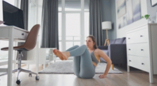 매트에 엉덩이를 대고 앉은 상태에서 다리를 공중으로 돌어줍니다. 손바닥은 바닥을 짚고, 몸을 V자 모양으로 만드세요. 그리고 복부를 중심으로 상체와 하체를 당겼다가 펴는 동작을 진행하면 되는데요. 1분 동안 운동합니다.