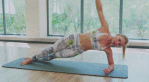 왼쪽 팔뚝을 매트에 대고 옆으로 누워서 시작합니다. 그리고 엉덩이를 들고, 사이드 팔꿈치 플랭크 자세를 만드세요. 그런 다음 오른손을 공중으로 들고, 팔을 내렸다가 드는 동작을 추가합니다. 30초 운동 후, 자세를 바꿔서 30초 반복합니다.
