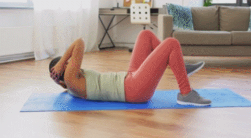 매트에 누운 상태에서 손을 머리 옆으로 옮기세요. 그리고 무릎을 세우고, 발을 매트에 고정합니다. 그런 다음 왼쪽 다리를 오른쪽 다리 위에 걸치세요. 상체를 일으키면서 오른쪽 팔꿈치를 왼쪽 무릎에 가져갑니다. 30초 진행 후, 다리의 위치를 바꿔서 30초 반복합니다.